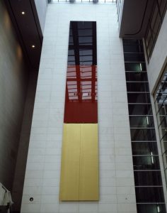 Även en glasmålning i svart, rött och gult som Gerhard Richter gjorde till den tyska riksdagen, dyker upp ur minnet. 1999 placerade Richter sin jättelika flagga i glas på en liknande avlång väggyta som den Erikssons målning hänger på. Men medan Richter i sitt verk understryker platsens funktion som nationellt parlament, pekar Eriksson snarare mot något som befinner sig utanför sjukhusområdet. Eller, om man så vill, mot den natur vi alla bär inom oss.