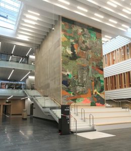 Så har då Andreas Erikssons väldiga målning ”Stenbrottet” kommit på plats i entrén till Nya Karolinska Solna (NKS). Nyligen var det öppet hus för allmänheten, men därefter stängdes sjukhuset igen inför den planerade inflyttningen under 2018. Erikssons målning mäter 11×6,5 meter och är monterad på kortsidan av ett enormt hisschakt som löper genom huskroppen. Målningen är så stor att det nästan inte går att förhålla sig till formatet, det finns inget att jämföra den med – annat än rummets egna proportioner.