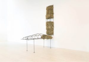 Också Theresa Traoré Dahlbergs ”Koppar och bomull” visades på samma utställning (ovan th). Och här är skillnaden ännu större. Verket, bestående av stansade kopparplåtar från tillverkningsindustrin och enkelt bomullsgarn, hängde också tidigare från tak till golv, men var betydligt högre , smalare och inte fullt lika sakralt. Här blir det nästan en postindustriell ikon som mediterar över den globala kapitalismens följder. Mycket snyggt, dessutom.