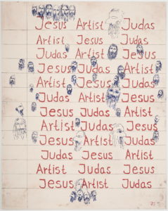 Det är sällan en måleriteknik i sig så genialt blir till ämne, men om tekniken till att börja med också framstod som själva huvudsaken har den nu utvecklats i stora, humoristiska och mångtydiga bildvärldar med fritt framspånade folkloristiska inslag. En himmel full av djävlar över en samhällsidyll. En präst som tornar upp sig över sin vita kyrka. I en av kanyl-brodyr-målningarna byter orden JESUS – ARTIST – JUDAS gång på gång plats med varandra (en ambivalens som också konstkritikern kan känna igen sig i: välsigna en utställning genom att skriva om den men förråda den genom att skriva fel saker). I en annan kretsar på liknande sätt ord för allehanda psykiska och moraliska defekter i sina banor runt mittpunkten ARTIST.