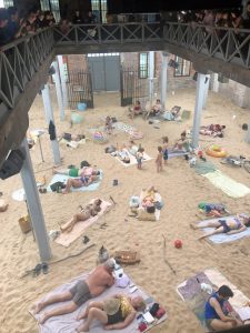 Biennalen är alltså inte särskilt hoppfull. Därför är det något av en fröjd att gå uppför de gamla trätrapporna i en av marinens byggnader strax intill Arsenalen till ljudet av vacker sång och musik skapad utifrån vågornas rörelser. Väl uppe ser man hur publiken lutar sig ut över ett räcke i dunklet med ansiktena upplysta av ljuset nerifrån. De ser ner genom en stor öppning till våningen under som har förvandlats till en sandstrand. Där ligger unga och gamla klädda i badkläder i pastell på handdukar och upplysta med starka lampor som av en sol. Här tycks en loj vardag pågå och visst är det vardagen man längtar till efter några dagar i ett dystopiskt mörker. Musiken är inspelad men sången i denna nyskrivna opera framförs live av badarna.