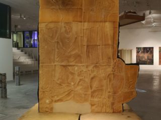 Django Giambancos (Marabouparken) väldiga materialobjekt är ändå i en klass för sig. Det är ett sånt verk som sätter myror i huvudet, och som jag längtar efter att få möta. Vad är det egentligen jag ser? Vad betyder det? Och varför har konstnären gjort just så här? En upprättstående relief, svart på ena sidan och gulbeige på andra. Ett avtryck från en kyrka på Gotland gjort av ull och minnesskum, om jag förstått saken rätt. Skugglika kroppar avtecknar sig i ”Mjukt beskriver hårt”, som tyvärr är Giambancos enda verk i utställningen. Jag hade gärna sett fler.