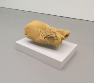 I utställningen finns en rad mjuka skulpturer i gulnat skumgummi. De får mig att tänka på hur sömnlöshet kan sudda ut gränserna mellan konkret och abstrakt. Det tunna tygöverdraget avlägsnat, som den sköra hinnan mellan vila och vaka, verklighet och dröm. I Nattvandring har skumgummit bearbetats med stygn som givit den formen av en torso med veck och fåror. En navel vränger sig ut ur väggen och skulpturen heter mycket riktigt Navel. Under den står Till bredden/Kar, ett badkar i gips med en vass och ojämn badkarskant för en mycket liten person.