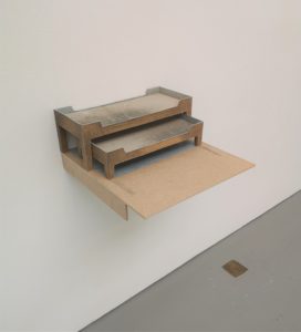 Här finns sängar som hör ihop med andra sängar. Den lilla sängen går att skjuta in under den stora sängen, som är framdragen men inte helt. Figuren återkommer i olika utföranden och berättar mycket med enkla medel. Att höra ihop och säras ut, att bli undangömd eller ges utrymme. Den lilla perfekt anpassad till den större.