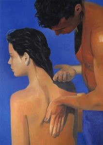 Joanna Persman: Den pågående utställningen med tydliga omtagningar av samma motiv är som en gigantisk installation. Det sprödaste materialet – de fjuniga maskrosbollarna som kan förintas med ett enda häftigare andetag – utgör mellanlänken. Vissna blad, torra stjälkar… Allt detta berättar om förgängligheten. Men också om återuppståndelsen! Maskrosornas frön kommer att spridas för vinden. Cirkeln blir sluten. Det är så Edefalks konst fungerar i mina ögon. Oavsett materialet hakar verken in i varandra och fortsätter med en berättelse om liv och död. Poängen tycks vara att det inte finns någon tydlig gräns mellan det som vi uppfattar som verklighet och det som tillhör andeväsen. Kanske lite som hos Hilma af Klint, fast i en postmodern tappning. Det är svårt att avgöra om gestalterna håller på att födas ur eller försvinna in i duken. Så är det med Baby, Red Girl, Marcus (Aurelius), Venus och August (Strindberg), som Edefalk för övrigt påstår sig att ha andliga konversationer med. Därför funderar jag också över de diffusa miljöerna gestalterna placeras i. Hur ska man tolka dem?