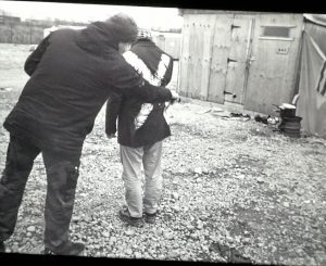 Żmijewski går in med kameran i det nyligen rivna flyktinglägret i Calais. Hans stumma film ekar av tidigt 1900-tal och visar upp människornas misär i kornigt svartvitt. Först tycks där finnas medlidande, men efter ett tag målar en person (jag läser det som konstnären själv) ett vitt kors på en mans kavaj och tar tag i en svart mans ansikte medan han vrider det granskande inför kameran. Varför? Och finns det en överenskommelse mellan konstnären och objektet?