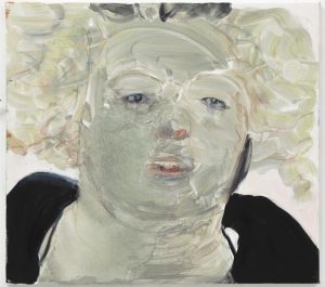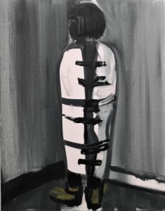 På den tiden var jag inte heller särskilt stolt över att vara målare, och fortfarande säger en del att de tycker att mina teckningar är bättre än målningarna. Ibland lyckas jag få till en bra balans mellan måleri och teckning, som med penseldragen i Straitjacket (1993) där den kalla gröna färgen på håret också är viktig. Titeln kom ursprungligen från en nyhetsbild av ett fängelse. Jag använder ofta färgerna på ett psykologiskt sätt, liksom Munch gjorde. Det handlar om att både tappa och att ta kontrollen över målningen och tolkningen.