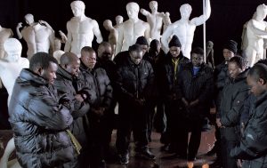De 120 skådespelarna som agerar i Rosefeldts verk sökte samtliga asyl under inspelningen och de utför schablonartade arbetsuppgifter som har kommit att förknippas med deras nationella ursprung. Här syns bland annat en långsamt snurrande karusell med romska kvinnor, ett museum fyllt med vita, antika marmorskulpturer där afrikanska dockförsäljare flanerar omkring förstrött och en kaktusfylld trädgård i vilken muslimska kvinnor märkligt nog dammsuger stenar. Det är surrealistiskt, och således förstärks distansen mellan betraktarna och aktörerna. De senares bisarra sysselsättningar driver med utomstående människors såväl granskande som förprogrammerade blickar. Iscensättningarna är artificiella och klichéartade, och blir därför svåra att tränga igenom. Stundtals stämmer de medverkande upp i körsång, vilket gör det teatrala draget ännu mer markant.