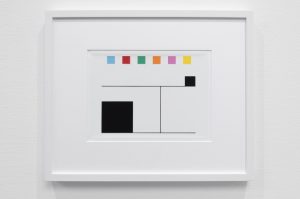 Ovanför formerna finns i varje målning också en rad mindre fyrkanter; i blått, rött, grönt, orange, ljuslila och gult. Färgerna upprepas i samma följd på samtliga bilder – och på en matta i det inre rummet – vilket understryker den underliggande ordningen. Vad är det för ett slags regelverk som målningarna ger uttryck för?