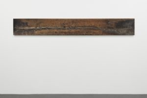 Mitt emot de abstrakta målningarna hänger, en bit in i rummet, två träplankor. Det är åtminstone vad jag tror att de ganska skavda och svartnade brädorna är, innan jag tittar närmare på dem och upptäcker att de är fotograferade. I naturlig storlek.