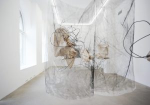 I sin andra separatutställning på ANNAELLEGALLERY fortsätter Leontine Arvidsson att utveckla sina gåtfulla skulpturer. Första gången fick järnet tala för sig självt när objekten stack ut från väggarna eller låg på golvet. Denna gång utgör armeringen ett skelett som svepts om med ett tunt tyg. Det spretiga och aggressiva har delvis tämjts av det mjukt omslutande. Konstruktionerna har därefter doppats i acrystal, som i sin tur fått torka fast till märkvärdiga, oregelbundna formationer. Samma skira tyg som används i skulpturerna hänger även som florstunna gardiner fritt i rummet.