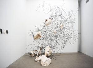 I installationen finns inget fram eller bak, ingen utsida och ingen insida. Blicken är vilsen kanske på samma sätt som inför en tuschteckning av Michaux. Ögat söker automatiskt efter något som det kan känna igen, benämna. ”Att se något som något…”, som Wittgenstein en gång uttryckte det. Beskrivningarna fastnar dock inte. Orden stöts bort av verken som fritt svävar över golvet i det stora gallerirummet. Verken tiger dock inte. De talar ett ordlöst språk.