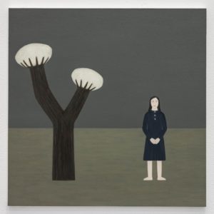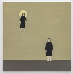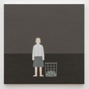 Det nordiska landskapet är synligt i Lundqvist palett, men platsen är lånad ut ur sitt sammanhang, och är placerad i en närmare existentiell kontext, där figurer näst intill svävar, i relation till två färgfält. Bilderna är jämna och en återkommande horisontal linje, som delar in bilden i två sektioner, ger snarare en markör av tid än perspektiv. Likt den japanska konstformen Kintsugi bär också Lundqvists verk på en väl synlig spricka i tillvaron, som framhävs med avvägd komposition och ömhet. Sprickan är en inre upplevelse snarare än teknisk. Bilderna har ju en fulländad precision. Men deras Noumenon, det som enligt Kant är vad jag upplever, synliggör något högst allmänmänskligt, och gör strävsamheten i det långsamma måleriet vackrare, ja enklare att ta till sig. Se bara in i figurernas ögon, eller uppmärksamma det ljus som får tiden att stanna när en kliver in i galleriet.