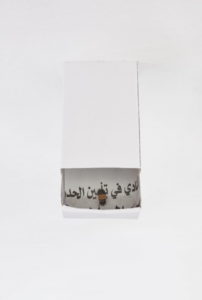 Hos Lagomarsino får vi veta vem som andats ut röken, när det skedde och vilket cigarettmärke det är fråga om. Så här formulerar sig konstnären i verkets titel: Air d’exil (we smoke for the dead, we store for the dead, but they are not dead), 2019, 20 handblown glass globes containing smoke from Oscar, nano slim cigarettes, smoked by Yazan, placed on podium.