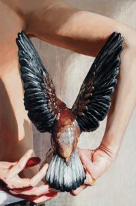 En kvinna böjer sig över ett krus, en annan bär på högar med kläder. en tredje trasslar med horn från skjutet vilt. Rovfågeln hålls fast bakom ryggen i en målning. Vingarna uppspärrade. I en annan är den snidad i trä. Omålad, fast är det ändå samma? Berättelsen lägger sig i lager, tvinnar sig kring distans och närhet, kontroll och ovisshet. Betydelser vandrar mellan målningarna, de övertar strukturer och bygger sammanhang.