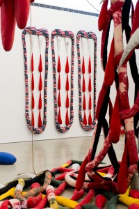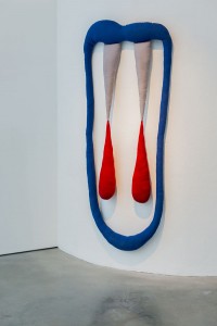 Jag gillar när sådana hjärnspöken uppkommer, men tror samtidigt inte att enbart dessa textila former gör rättvisa åt Rubys konstnärskap. Att döma av bilderna på hans hemsida är hans konst betydligt mer skräpig och kladdig i andra medier. Om man vill ha en något fördjupad förståelse av Rubys konst kan man gå till Moderna Museet. Där visas just nu en av Rubys totempålar i den nya hängningen av samlingarna. Det är en sorts blodröd stalagmit, en uppåtstigande pelare som reser sig mot taket i sällskap av verk av andra ”proces-målare”, som Tauba Auerbach och Wade Guyton. Skulpturen är som framplockad ur ett mörkt skrymsle, och kanske har den tillverkats av någon av de asociala gestalter som uppträder i Rubys videor (varav ett flertal går att se på hans hemsida). Ett par av dessa existentiellt utgrävande filmer hade varit ett utmärkt komplement till ”Soft Work”, en verkgrupp som nu framstår som mer harmlös än den egentligen är.