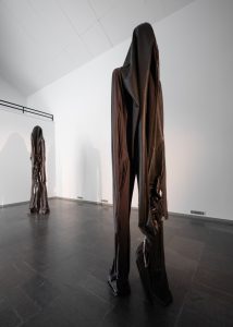 I ett rum tornar Sandra Mujingas olycksbådande figurer upp sig, iklädda grått tyg med huvor. Deras enorma storlek, i kombination med att de påminner om människor utan att för den skull vara det skapar en stark känsla av olust. Känslan förstärks ytterligare av det faktum att betraktaren vet att det är döda objekt. Tänk om det under de gråa tygstyckena finns något levande, något utom denna värld? Samtidigt finns det i figurernas framåtlutade ställning och gråa färger något som också får mig att tänka på elefanter, vilket i sin tur ger en känsla av trygghet genom att jag kan definiera det jag ser inom ramarna för vår gemensamma världsuppfattning. Mujinga manipulerar briljant med våra känslor utifrån vad vi bedömer som igenkännligt eller främmande.