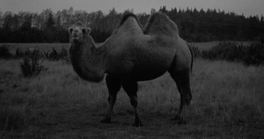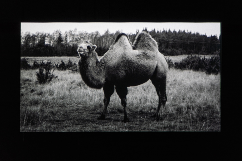 Fångad i en evighetsloop är däremot kamelen som Zouiten filmat på det öländska alvaret. Jag har på genomresa själv sett de ståtliga varelserna stå där, än mer osannolika i sina puckelformade skepnader i det svenska sommarlandskapet. Videoverket visas i helt litet format i en svart box i det mörklagda galleriet, vilket ger en intimitet. I den korta svartvita loopen möter kamelen långsamt min blick med ett mörker och djup, som hade den levt genom sekler.