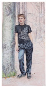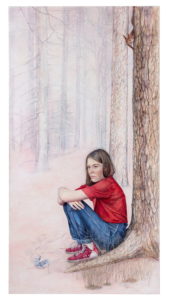 Jag betraktar Martinas träd så länge att jag till slut tycker de tittar tillbaka på mig. Träden ger barnen skydd och något att luta sig emot. Deras hår är så verkligt att jag slutar undra hur det är möjligt att måla så. Jag lyssnar istället efter vinden i grenverket. Upptäckten av den svaga fläkten i ett par hårstrån gör att jag försöker höra suset mellan stammarna i en målad skog.