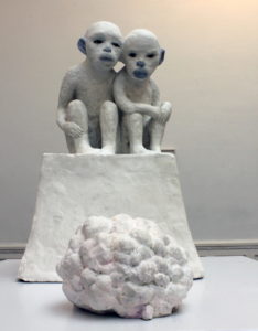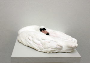 Jag skriver människor och djur men de är allesamman varelser ur samma mångtydiga berättelse, uppfyllda av varken eller och både och. Barmen utmejslar ambivalensen precist i sina förenklade figurativa former. Hennes skulpturer brukar kallas lågmälda men jag tycker att de ropar inifrån sina dolda verkligheter. I utställningen Skeppsbrottet finns några av de modigaste skulpturer jag har sett av Barmen, det är med en insisterande djärvhet hon flyttar på skulpturernas uttryck, närmare och närmare tydligheten utan att de förlorar sin mystik. De vita, monokroma verk som tidigare har dominerat har givit plats åt bemålade skulpturer vars färger har blivit bestämdare och skiljer sig från akvarellmålningarnas svärta och giftigare kulörer. I hennes helt egna pastellpalett finns inget av pastellens undanglidande vänlighet.