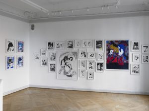 Ester Eriksson är en känd serietecknare. Flera publikationer på Kartago förlag har lovordats. Konstpubliken har sett hennes bilder på Skissernas Museum i Skärhamn. Teckningarna och en bronsskulptur är allmängiltigt namngivna: Untitled. Uttrycket och budskapen i bilderna och väggmålningen är desto distinktare; Långben, konstnärens alter ego har det krångligt. Medicinering, killar, manshat, leda och problem, men entusiasm och ensamhet på det. Det är dråpligt och mänskligt. Olyckligtvis gör de stora vita ramarna teckningarna en otjänst. Bilderna förpackas till behändiga objekt och det rimmar illa med deras lika råa som ömtåliga budskap.