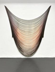 De andra två verken lämnar inte betraktaren riktigt lika konfunderad. Åtminstone inte initialt. Ett av dem, ”Broken Flag” består av metervis med infärgade tygremsor som är sammanknutna på vad som liknar en stålram. ”Corral” är ett målat kanvastyg som repats upp till tunna, fina trådar. Som att tygets innersta beståndsdelar exponeras. Konnotationerna är många men kanvastyget och de öljetter som håller verken på väggarna ger en oundviklig maritim känsla, som dock motverkas av den mer jordigt naturnära färgskalan med associationer till gran, ljung och lera. Betraktelsen av verken blir en djupdykning i en värld utan tydliga regler eller förhållningssätt. Med myriader av tolkningar men inget facit.