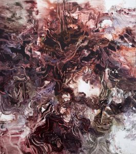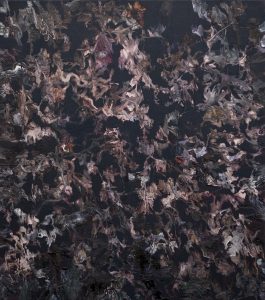 Här fylls varje målning av ett furiöst virrvarr av vegetation, ett febrigt trassel av hopflätade slingor. Jordfärger och purpur dominerar och palettkniven är lika flitigt använd som hårda penslar. Handlaget förefaller spontant och besläktat med De Kooning, Pollock och Rehnbergs senare målningar, men mina associationer går också längre tillbaka till apokalyptiska barocklandskap. Här och där skymtar fragment av landskap, stormiga hav, figurer eller ansikten och någon gång en löftesrik ljusöppning. I varje liten detalj uppstår automatiskt en myllrande visuell rikedom, betingad av Ekstrands måleriteknik. Den fungerar mer övertygande på duk än i en svit målad på plastfilm där tekniken inte riktigt får samma resonans.