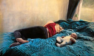 Karin Broos realistiska måleri har alltid något oroande över sig, hennes till synes lugna kvinnor ruvar alltid på något och stannar man bara upp en liten stund inser man att det kan storma rejält i de lugnaste vattnen. Bildserien ”Det stora blå” är inget undantag där en nyfödd bebis vilar på ett havsblått quiltat sängöverkast. Bredvid mot väggen och med ryggen mot bebisen ligger en kvinna. Det finns en känslokyla i bilden och i nästa bild i serien anar man att barnet är dött. Den nyfödda bebisens nakenhet, svarta navel och slutna ögon utstrålar allt annat än liv och den tycks sväva fritt i ett oändligt hav. Det är stilla, fint och lugnt, men dött.