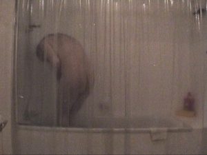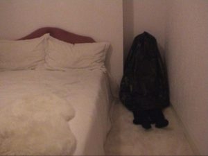Jag lämnar det ångande badrummet och går in i sovrummet intill. Och där möter mig en ännu mer makaber scen. Om det var mamman och pappan jag såg tidigare är det väl barnet jag ser härinne. En liten gestalt som sitter på golvet bredvid sängen med en svart sopsäck över huvudet. Benen sticker ut under säcken, som annars täcker resten av kroppen. Det är alldeles tyst därinne. Finns inte ens några fönster.