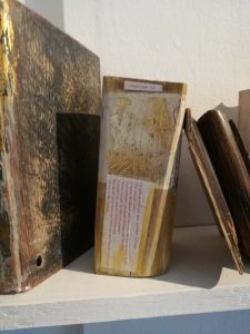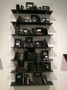 Haeberleins bokrader försöker efterlikna själva begreppet ”bok”. Och lyckas väldigt bra med det. De föreställer verkligen böcker trots att de består av olika grova träbitar. Med påklistrade collagebilder och textlappar antyder de försiktigt sitt innehåll. Det är fenomenalt hur till synes lätt och ledigt Haeberleins förvandlar sitt material. Det hårda träets ådringar blir till mjukaste papper framför våra ögon. På väggen ovanför böckerna har Haeberlein skrivit ett citat av Rilke: ”Allt trängs i oss. Vi ordnar det. Det störtar. Vi ordnar det på nytt och störtar själva.”