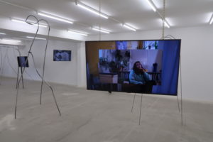 Mellan bildskärmarna som påminner om märkliga, svarta rektangulära frukter, där de hänger i guldglimmande kedjor från taket, står spretiga och risiga metallskulpturer. Både vassa och sköra. De är ett slags mekaniska insekter besläktade med Louise Bourgeois menageri, skulpturala teckningar, tecken eller varför inte revor i utställningsrummets rymd genom vilka man skulle kunna ana andra världar och slutsatser. Skulpturerna rimmar med videoessäernas spretighet, men talar ändå ett annat språk. De är bångstyriga och går sin egen väg och tillför helheten en avgörande komplexitet.