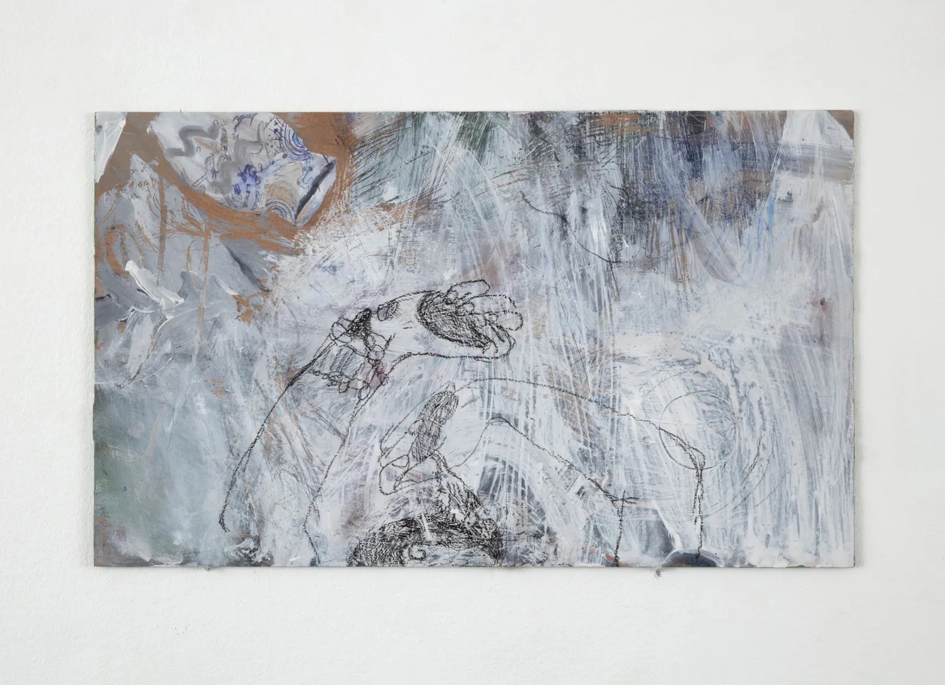 Resten av målningen ett gråvitt flimmer, med virvlande penseldrag och en antydan till ett brunt grenverk i ena hörnet. Denna atmosfäriska dimma utgör Billgrens egentliga motiv, och det återkommer i ytterligare en snarlik målning och i en teckning, samt i ett tygtryck på en pall i galleriet. Nu är upprepningen egentligen inte överraskande, eftersom utställningen i övrigt domineras av variationer av ett par landskapsmotiv.