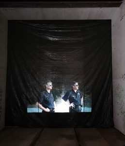 Tonen sätts redan vid ingången med Tova Mozards video som visas mot en hängande plastpresenning. Vi ser två poliser som för ett trevande samtal, eller om det är två skådespelare som osäkert prövar ut sina nya roller? De lyckas väl så där, vi känner igen poserna från amerikanska polisfilmer men anar samtidigt ugglor i mossen. Presenningens tillfälliga projektionsyta förstärker det instabila läget, vilket går igen i flertalet av utställningens verk.