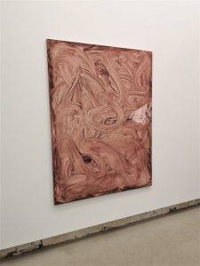 I alla fall är det så det ser ut. På Stene Projects visar Ojanen tre stora akrylmålningar, som alla är täckta med svepande penseldrag i olika brunröda toner. Eller penseldrag förresten, av utställningstexten framgår det att han använt en skurmopp, vilket naturligtvis spär på mitt intryck av att Ojanen rengör bildytan. Snabbt och effektivt vill hans svepande färgrörelser betona ett avstånd till tidigare spår av måleri.