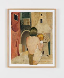 Asyle de Nuit föreställer en person med bar överkropp som bär ett barn i sin famn. Bådas ansikten är bortvända, riktade mot ett mindre torg och en välvd öppning som leder vidare in i en gränd. De jordnära färgerna och arkitekturen får mig att tänka på varm högsommarluft någonstans i södra Europa och smutsen från marken som dammar vid minsta vindpust. Men verket tycks också ge uttryck för en avsaknad av någonting. En lång väntan som pågått i dagar, veckor, kanske månader. Till vänster står en rödfärgad byggnad vars vägg tycks blöda, två långsmala mörkröda droppar rör sig ner mot den spräckliga beigefärgade marken.