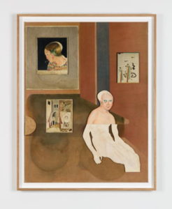 Två andra inramade verk har liknande svartvita bilder klistrade på väggen vid sidan om sig. Den ena bilden föreställer de målade flamingor som återses i flera verk, och den andra är ett uppochnervänt porträtt av kvinnan som i färg återges innanför ramen bredvid. Det är här någonstans som min blick tappar fokus. Kanske kan bilderna på väggarna uppfattas som en förlängning av konstverken ut i rummet. Ändå uppfattar jag det inte som en rumslig installation i likhet med Fänges tidigare arbeten med den 15 meter långa motivtapeten och andra objekt i soloutställningen Drömmarna på Bonniers konsthall år 2018.