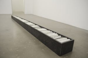 Det närmast perfektionistiska hantverket och den osentimentala sakligheten är besläktad med amerikanska minimalister som Judd och Serra. I galleriets verkförteckning hittar jag inga titlar, bara torra, exakta mått- och materialuppgifter. Men under ytan vibrerar en dramatik där det rent fysiska glider över i det metaforiska med associationer till kosmologi eller psykologi; i det avseendet kan hon ibland påminna om Robert Gober.