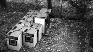 I trappavsatsen mot den nedre våningen pågår The Haven, ett videoverk av Petronella Petander. Ett verk som också visas just nu på Bonnierskonsthall.se. Jag hade inte sett verket innan och kände heller inte till den bakomliggande historien. I trappan ned från övervåningen finns 6 stycken ljudinspelningar som ger en bakomliggande bild av filmen. Är dock glad över att jag lyssnade på de sex ljudspåren efteråt, för på så vis blev filmen mer mångbottnad. Blev rörd till tårar av videon. Trodde först den handlade om en liten grupp barn, rumänska tiggare, som tillsammans med sin mamma sökte efter platser att kunna andas ut på, få vara människa på, runt om i världens alla olika tvättstugor. Men fantiserade också om hur utanförskap kan vara en människa som har ett hem, men aldrig kan komma in i samhället. Utfryst av normer och fördomar. Där tvättstugan för den människan blir ett fönster mot världen, likt Facebook, där man låtsas vara en person man aldrig blir. För en liten stund, fri. Ensamheten är lömsk och ett aldrig sinande ämne, även för de som aldrig varit hemlösa. Filmen grep tag om mig på djupet. Den är exakt avskalad och ändå med en perfekt densitet av sitt eget innehåll.