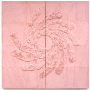 Fight Flight Freeze II är en målad trärelief av Ferdinand Evaldsson. Titeln antar jag syftar på den fysiologiska termen med samma namn. Där en neurologisk reaktion, amygdala skickar signaler till hypothalamus, som stimulerar det autonomiska nervsystemet ANS. Det är kort och gott kroppens reaktion vid fara. Målningen föreställer armar med händer som greppar varandra i en cirkel. En kroppslig mur med en potentiell öppning? Målad med falurödfärg och krita som ger färgen mestadels en rosa ton. Det finns en perfektion över Evaldssons samtliga verk. De är vackra och subtila men samtidigt lite obehagligt aggressiva, i sin tillrättalagdhet. De två motpolerna ger dock en intressant spänning åt verken. Ser fram emot att se kommande utställningar, då jag tror Evaldssons verk dyker upp på många ställen framöver.