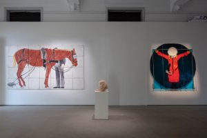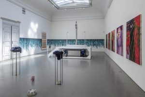Bland masterstudenterna märks ett stort intresse för måleri i relativt storskaliga format och i flera fall i kombination med andra medium. I Filippa Wikners ”I See no God up Here” glänser färgen i tjocka lager i den pop-inspirerade glasmålningen tillsammans med fresken ”I Understand You”, uppdelad på flera mindre bitar, och en mindre skulptur. Axel Versteeghs stora tavlor kombineras med ett ljudspår av suckar, smackande och klickande ljud. Ja, i princip alla ljud människan kan göra med munnen finns representerade. Här möts måleriets mörker med humorn i ljudspåret, figurerna kommer till liv och leder oss in i en absurd men ändå tilltalande värld.