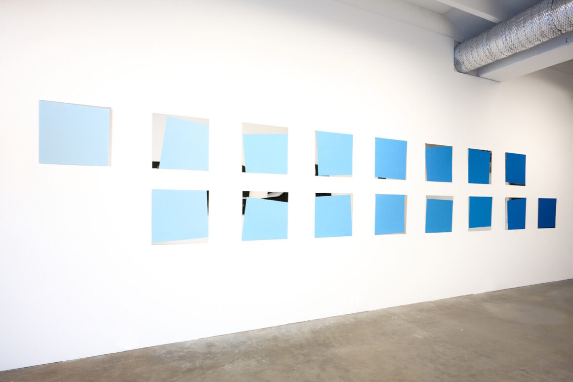 För att få rätt matthet har hon blandat bivax i oljefärgen, och bockat metallens övre kant så att målningarna får drag av objekt. Nyanserna skiftar nästan omärkligt från ljusaste gryning till ultramarin. På nära håll står de målade fältens knivskarpa linjer i kontrast till penseldragens avtryck, med sina spår av handens arbete. I gliporna som uppstår mellan färgens och plåtens kanter reflekteras omgivningen och blir en del av verken. Det gäller såväl molnen över hamnbassängen utanför galleriet, som glimtar av min egen spegelbild.
