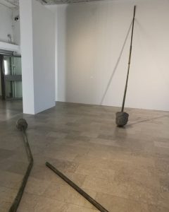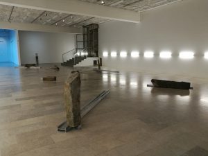 Redan före jul kunde vi se en mindre presentation i galleri Elastics nya lokaler på Östermalm här i Stockholm. Betydligt fler verk tar nu plats i museets Stenasal, omgjord till två rum med varsin verksvit i varje. Det rör sig dels om långsmala spröt till skulpturer gjutna i brons, som vilar på golvet och reser sig mot väggen, och dels om en svit objekt som kopplar samman stenens organiska tyngd med aluminiumbalkens industriella estetik. Huggna bumlingar av basalt samexisterar med gjuten metall.