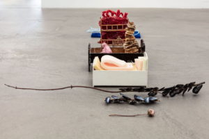 I ett annat verk ligger olika funna objekt uppradade på golvet, noggrant bearbetade och anpassade. Det verkar vara skapat av nödvändighet i ett försök att tolka och kartlägga ett inre skeende, eller skapa struktur kring en yttre händelse. Målningarna som omger objekten blir till ett slags drömfångare, en första instans i (dröm)processen. Färgskalan rör sig hoppfullt mellan röda, rosa, lila, bruna och gula toner i denna i alla avseenden mer kompletta utställning.