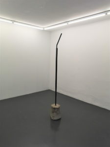 En ensam pinne i räfflad brons reser sig ur grov betong, en smalare pinne böjer sig i vinkel ut ur det upprätta, likt ett huvud, på samma gång både böjt och trotsigt. Associationen till pinnen som kropp kanske delvis härrör ur upplevelsen av Lars-Olof Loelds strama vertikaler som nyligen ställdes ut på Konstakademin. Jag funderar över om de försenade skulpturerna verkligen kommer att lindra det ensamma uttrycket hos Here, here.