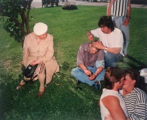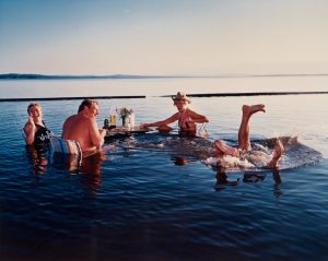 En aspekt av fotografier är deras starka egenskap att förvandlas till historiska dokument oavsett vilket sammanhang de är skapade i. Tunbjörks arbete Landet utom sig har förändrat karaktär och nu med historiens glasögon ser jag arbetet med delvis nya ögon. Ironin och satiren som tidigare kändes så påtaglig har nu mer av nostalgi över sig. I de två unga barn som blickar ut över ett nybyggt köpcentrum med likadana jackor och cykelhjälmar ser jag nu två beskyddande syskon. Jag tänker att färgen för länge sedan flagnat på byggnaderna i bakgrunden och att varumärkena inte längre finns kvar. Nostalgin tar tag i mig, och det slutar inte här. Jag ser ett ungt kärlekspar som kysser varandra i en pool full av bildäck, en morfar som leker med barnbarnen uppmuntrad av en tomtefigur, och jag ser ett kul kalas jag gärna skulle varit på. Det som då kändes som en ny bild av Sverige har förvandlats till dokument av det förgångna.