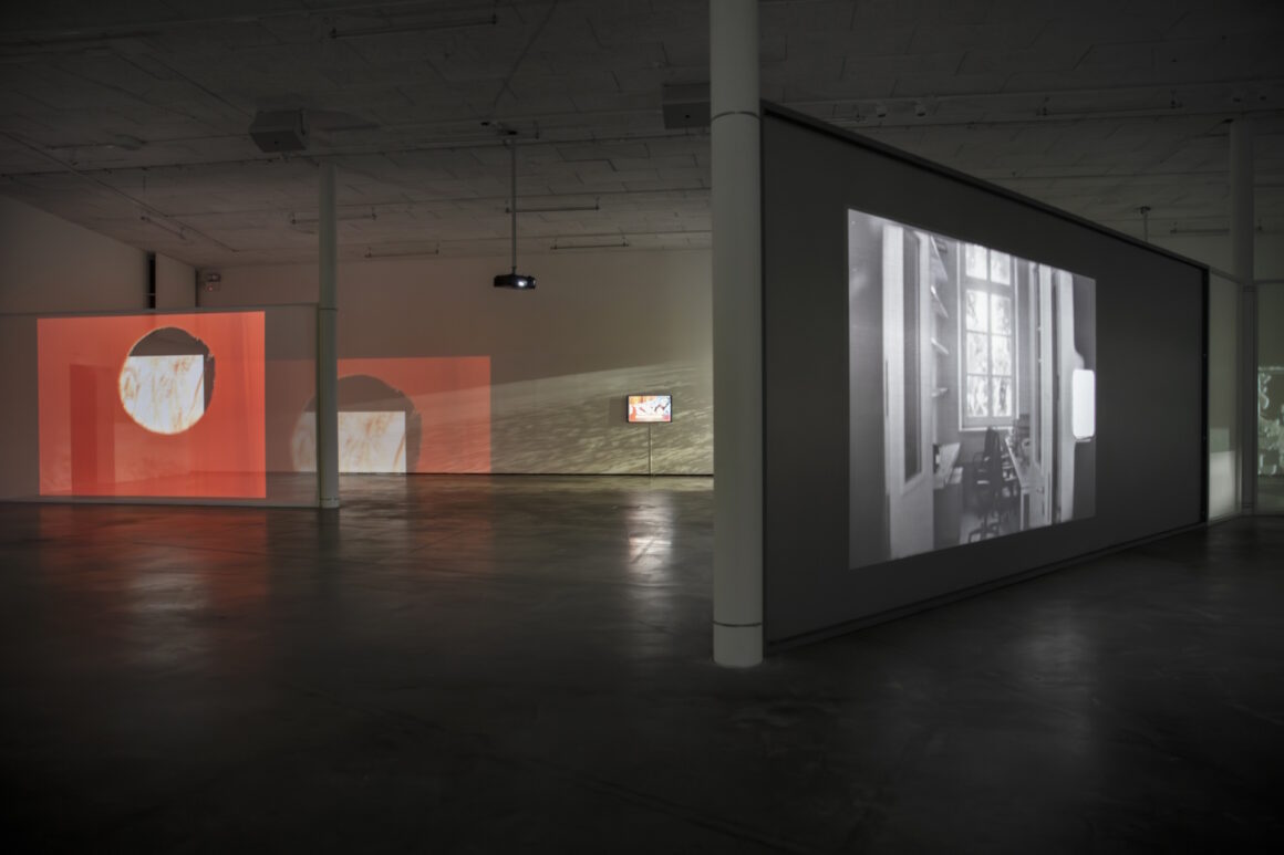 Inne i Marabouparkens stora utställningssal har verken gestaltats till en omslutande audiovisuell installation som dock inleds med ett diskret och taktfullt inspel. En camera obscura-inspirerad projektion där en ljus cirkel rör sig över en filmduk spänd tvärsöver salens gradäng. Cirkeln är tillräcklig stor för att ana de infångade motiven; en prunkande grönska med exotiska växter här, en grå kontorsliknande miljö där. The eye is the first circle (2023) anger med all övertydlighet både premissen och kruxet i utställningens utgångspunkt – det seende ögat. Det är en träffande start.