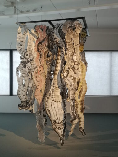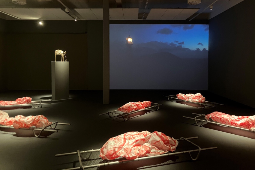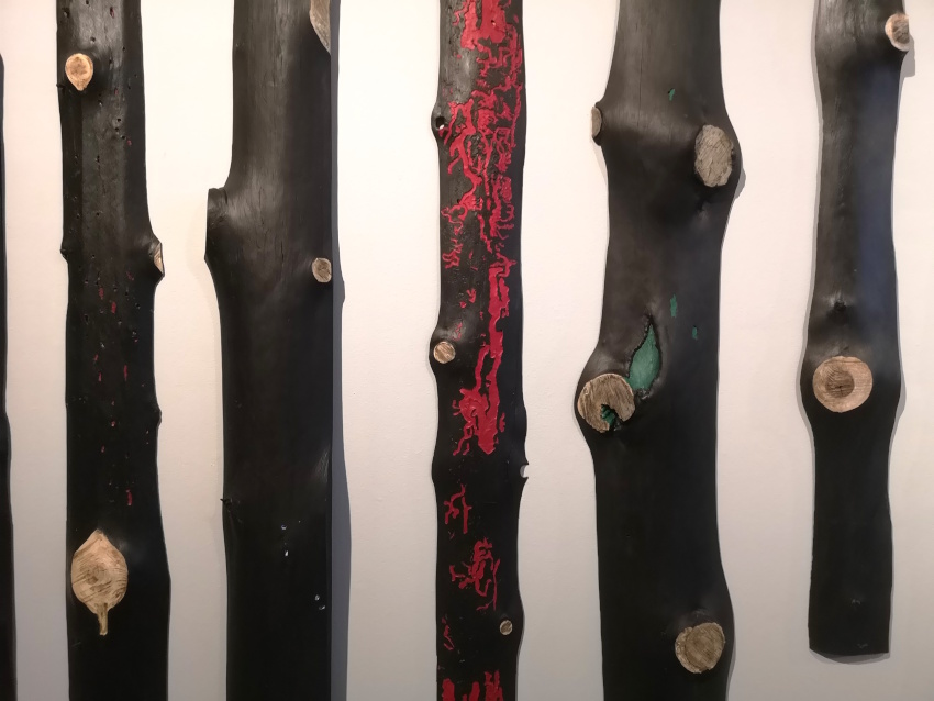Själv dröjer jag mig längst kvar på översta våningen, där ett antal stora röda tuschteckningar ligger likt räddade eller hopskrynklade kroppar på bårliknande metallbäddar. Titeln ”Från havets botten” leder tankarna till en räddningsaktion med osäker utgång. De bemålade trädstammarna ”Vittnena” avslöjar dock ingenting om vad som skett mer än att de betonar att de varit närvarande.