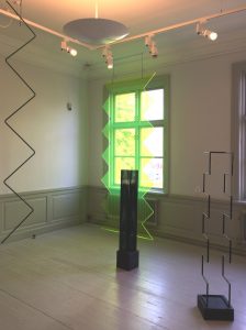 Utställningen är ett lyckat möte mellan de båda konstnärerna och som helhet lyckas de också inta den unika miljön. Løws monokroma skulpturer i plexiglas New Patterns, 2018, hänger stiligt framför de spröjsade fönstren och filtrerar den starka vårsolen (tv). Ett rum färgas i rosa, ett annat badar i grön neonkulör. Gert Marcus skulptur, Undersökning av kaos nr. 62, är den sista han gjorde innan sin bortgång (nedan th). Den är liten, inte mer än 35 cm hög, en studie i målad papier-maché. Spröd, men stilsäker står den där på en låg sockel alldeles självklar och tar rummet i besittning.