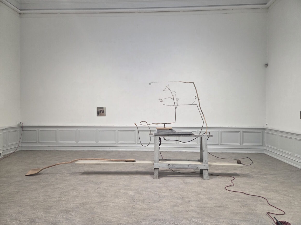 Redan från tröskeln drar ett antal utspridda objekt in besökarens blick i Malin Bogholts utställning på Konstakademien. Att det är ett slags skeende som pågår här, om det skvallrar de röda elkablarna som är inpluggade i väggen. Försiktigt rör man sig så in bland verken och möter initialt en flera meter lång täljd slev, balanserad på en hög ställning, liksom utdragen i en drömsk gest. Under detta objekt i trä: en roterande spatel som primitivt mal torkade blommor.