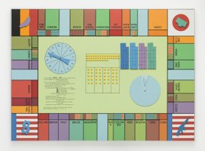 Öyvind Fahlström var en konstnär som ställde sig liknande frågor, eller åtminstone fungerar hans verk som möjliga försök till svar. Av hans fem verk som ställs ut i den aktuella utställningen på Moderna museet, är två särskilt tydliga exempel på tillgängliggörande kartläggningar: World Trade Monopoly från 1970, och Världsbanken från året därpå.